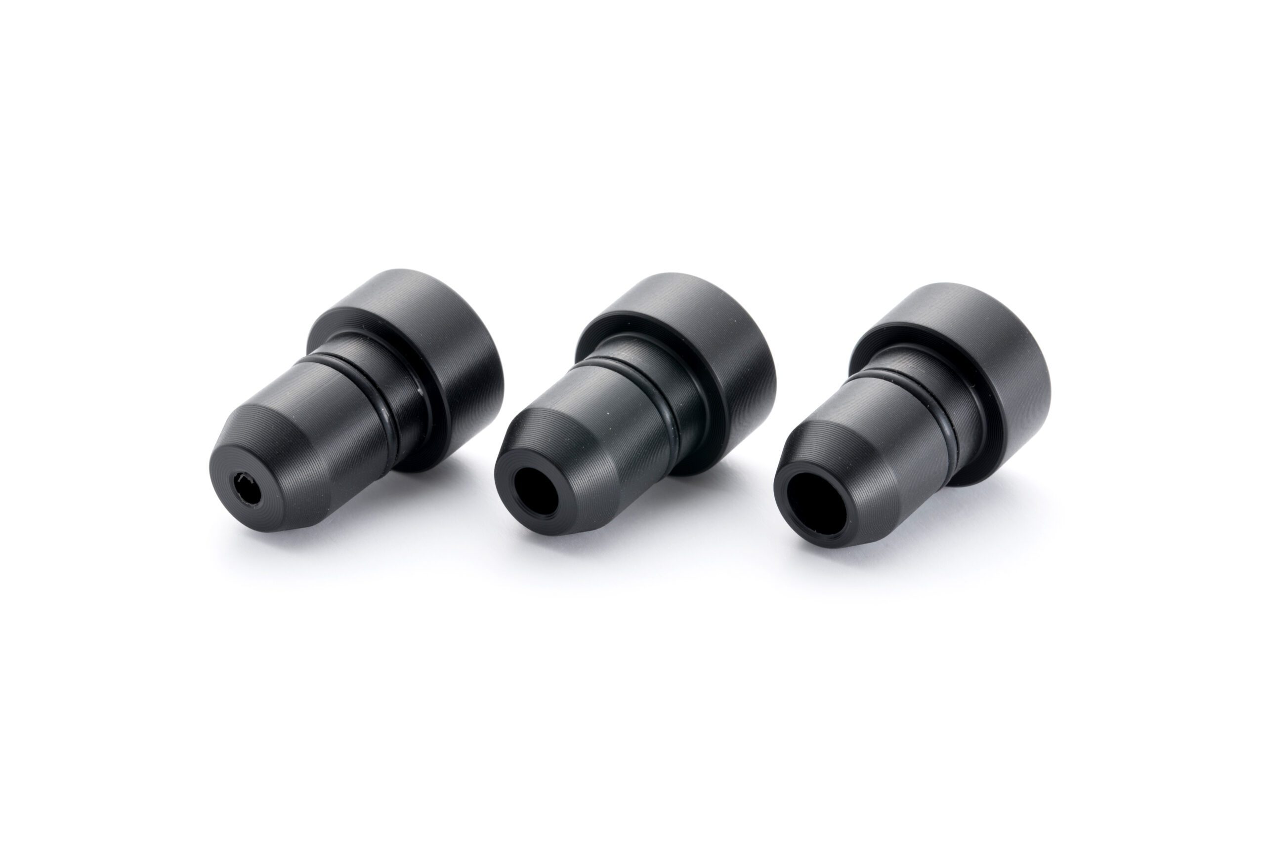 The Rotur Finial Mandrel is a unique product that fits into the tail stock and offers support for the fine end of a finial. This allows you to turn to a very small diameter without snapping or bending the workpiece. Included are 3 Delrin inserts with 3mm, 4.5mm, and 6mm holes. These can be changed depending on the size of the Finial being turned. They fit into the inner race of the free-running bearing in the mandrel body. The inserts can be drilled out or modified to suit your requirements. A spare set of the 3 inserts is also available (FIS1).